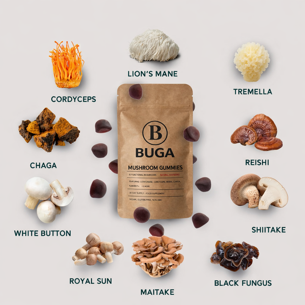 Mushroom Extracts (250mg each): Lion’s Mane, Cordyceps, Chaga, Maitake, Shiitake, Reishi, Tremella, Royal Sun, Black Fungus, White Button.